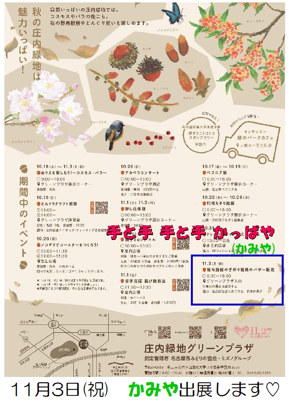11月3日、手と手 手と手 かっぱや(かみやが福祉活動をする時の別名です)は、名古屋市西区庄内緑地公園の『秋の華まつり』に、守山区の福祉施設 あさひ会 白沢作業所さんと共に出展致します!