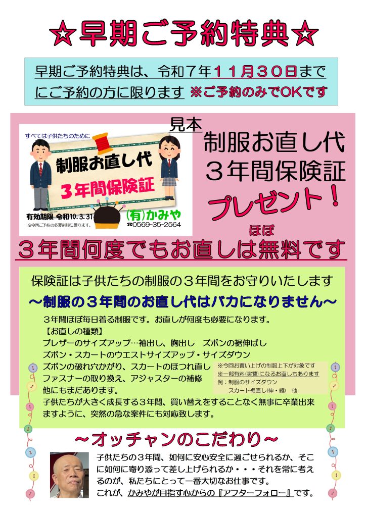 かみやの一番のこだわりは、「3年間安心安全に着用して頂けるためのアフターフォロー」です。11月末日までに本採寸のご予約を頂戴した方には、『制服お直し代 3年間保険証』をプレゼント致します。