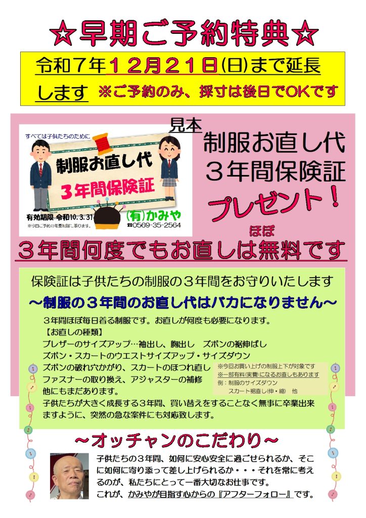 スタッフ、メーカーさんとの話し合いの結果、早期特典「制服お直し代3年間保険証」適用のご予約締切日を、当初の期日から12月21日(日)まで延長することと致しました。